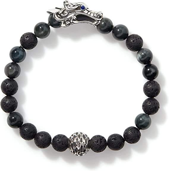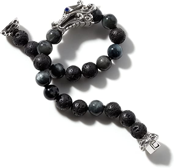 John Hardy Men's Legends Naga Silver Bracelet with Pusher Clasp with 8mm Eagle Eye & 8mm Black Volcanic Beads and Blue Sapphire Eyes
